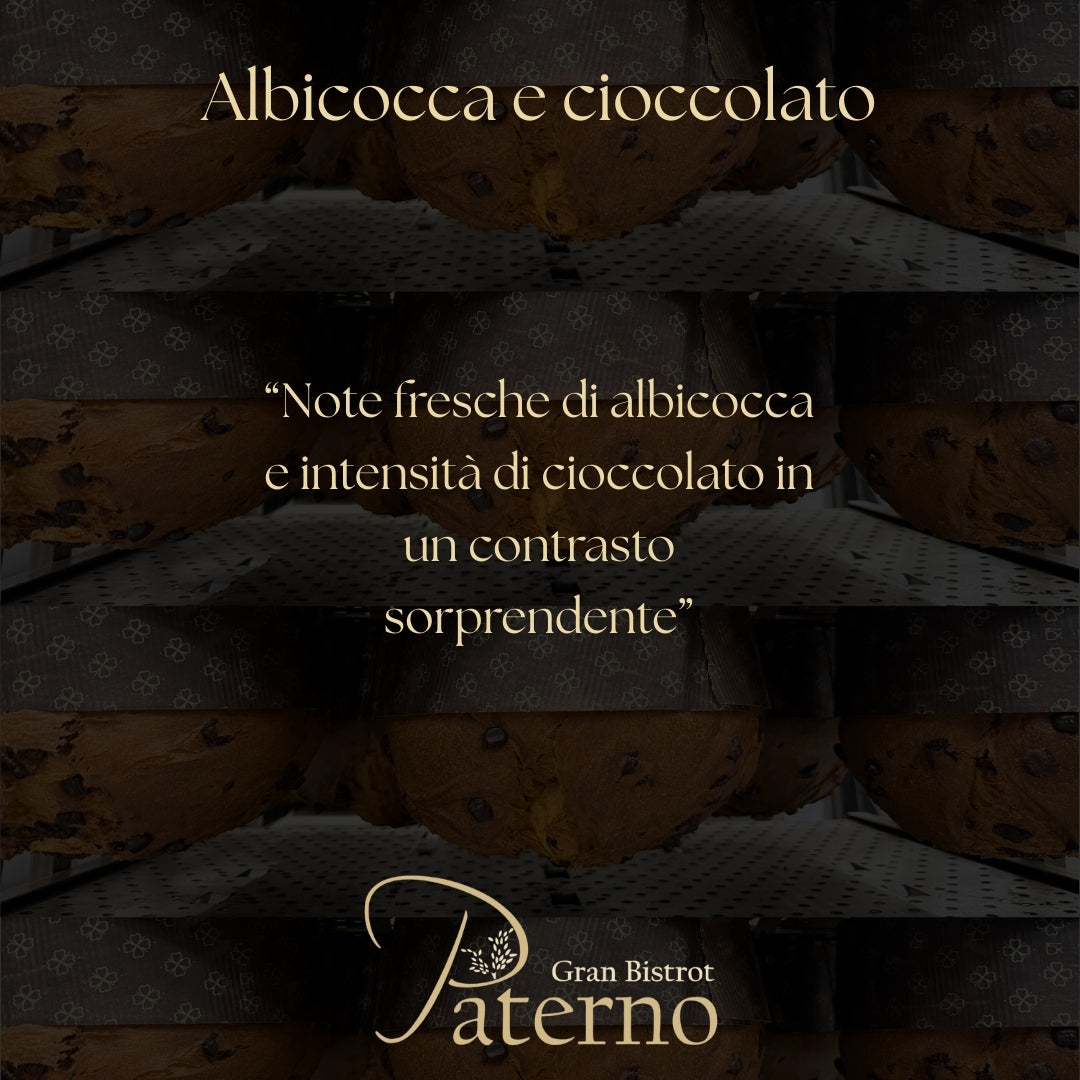 L’albicocca regala note fresche e leggermente acidule che si fondono con la profondità del cioccolato, creando un panettone sorprendente e mai banale.